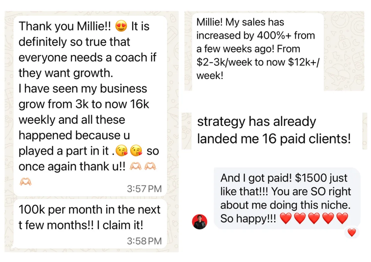 Clients landing their first paying clients, US$5,000 day, US$10,000+ months, and US$25,500 month